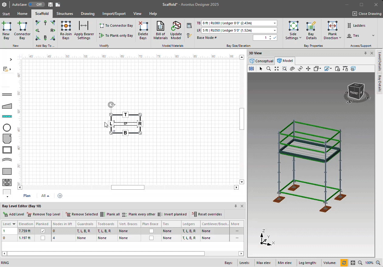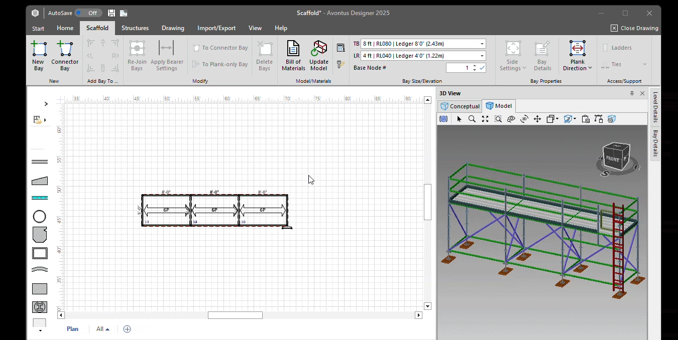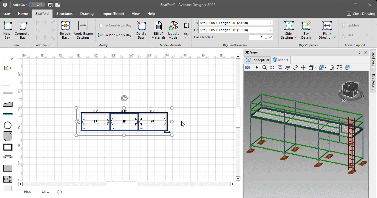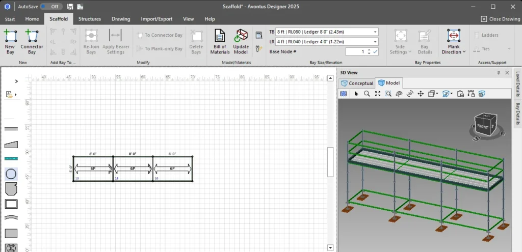 1. To add a new scaffold bay to your design, click and drag New Bay to your drawing page from the Scaffold tab. Once you’ve added the bay to your drawing, you can view the object in 3D and edit the bay level details.