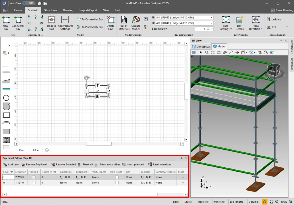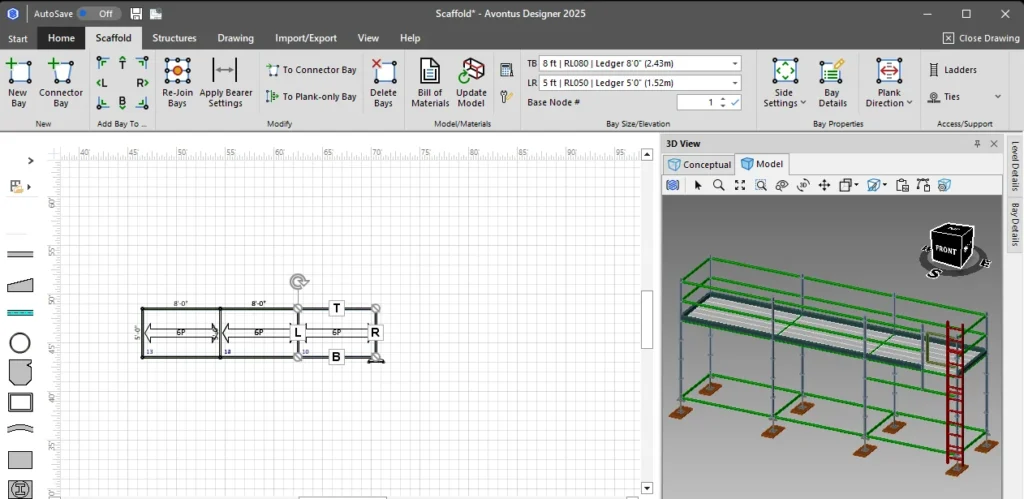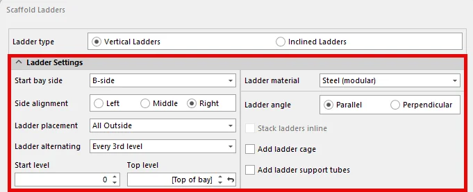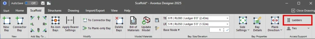 1. Select the bay where you’d like to add the ladder and, under the Scaffold tab, in the Access/Support group, select Ladders. Under Ladder Settings, change Start bay side to B-side, change Side alignment to Right, and Ladder placement to All Outside.